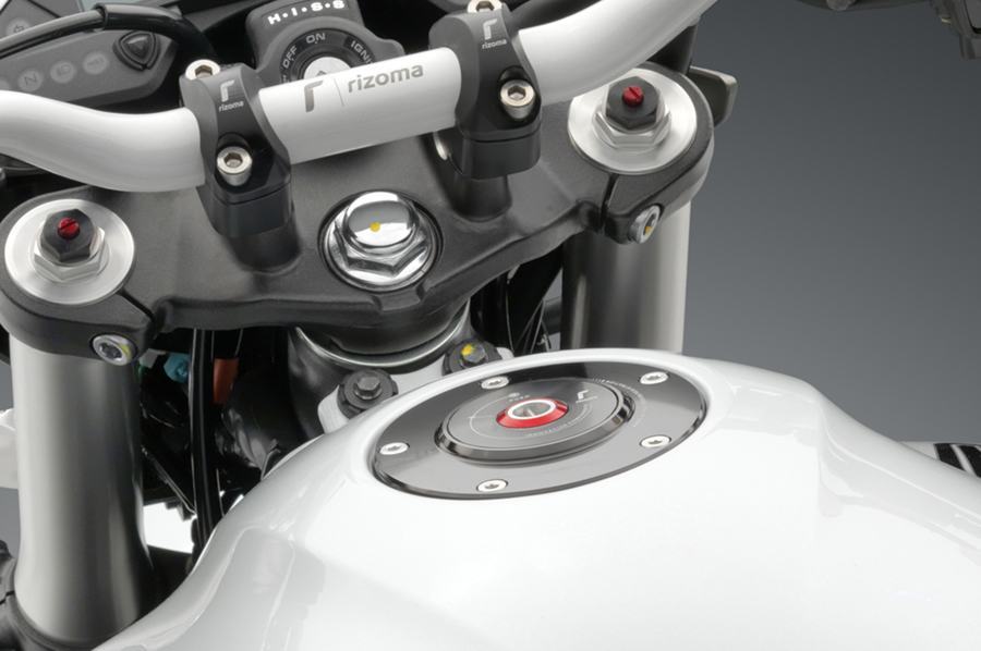 El tapón de gasolina es un elemento muy funcional que además aporte un toque de diseño y distinción a la Honda Hornet. Rizoma lo ha desarrollado en color aluminio natural o negro y con la certificación TUV. Con solo un click sobre la llave especial que se incluye con el tapón se puede abrir el depósito.